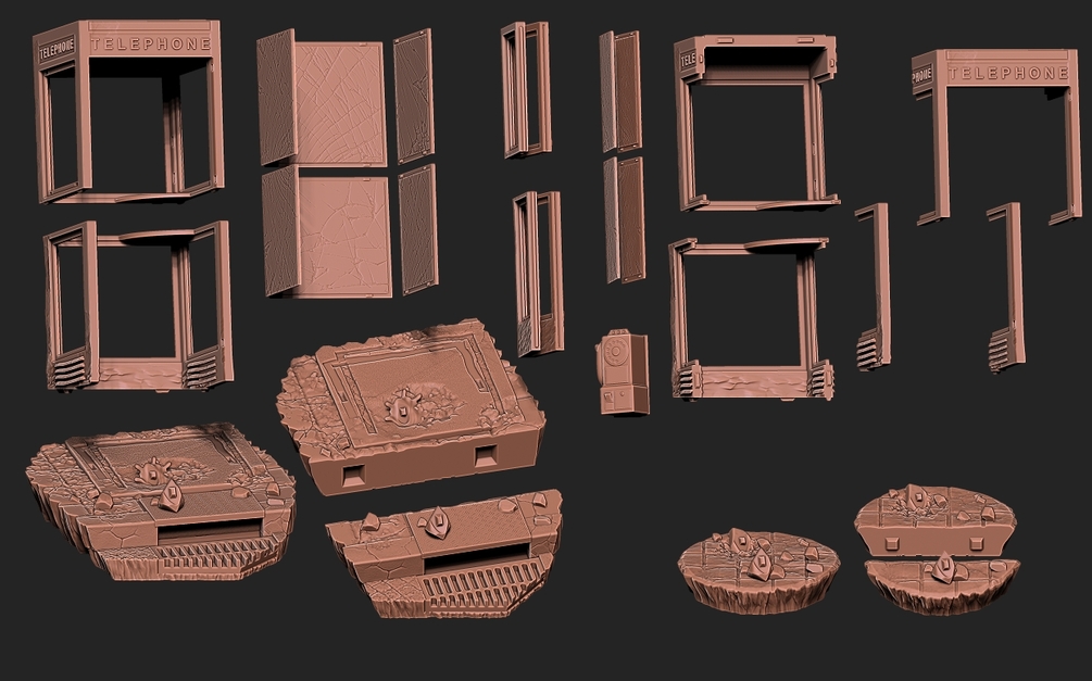- The most complex one: includes the phone booth and damaged glass for those who might want to print them in translucent resin